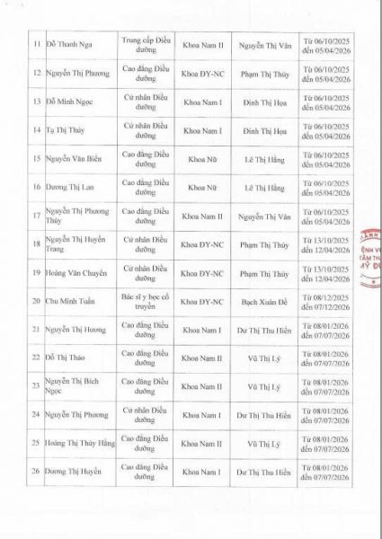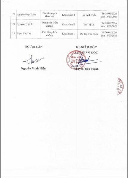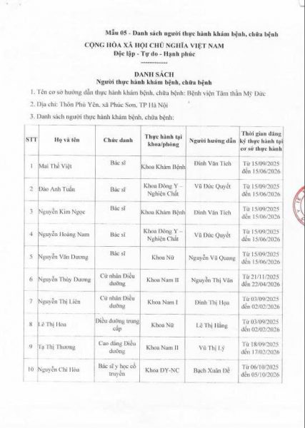 Danh sách người thực hành khám bệnh, chữa bệnh tại BVTT Mỹ Đức