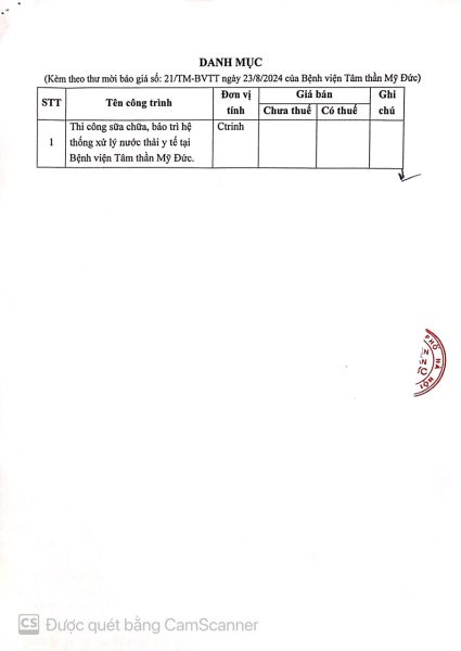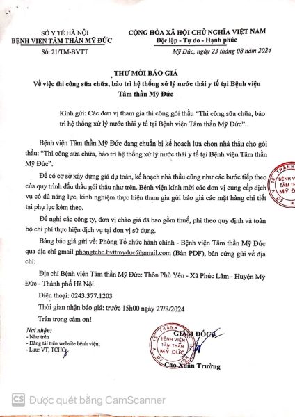 Kính gửi: Các đơn vị tham gia thi công gói thầu “Thi công sữa chữa, bảo trì hệ thống xử lý nước thải y tế tại Bệnh viện Tâm thần Mỹ Đức”.