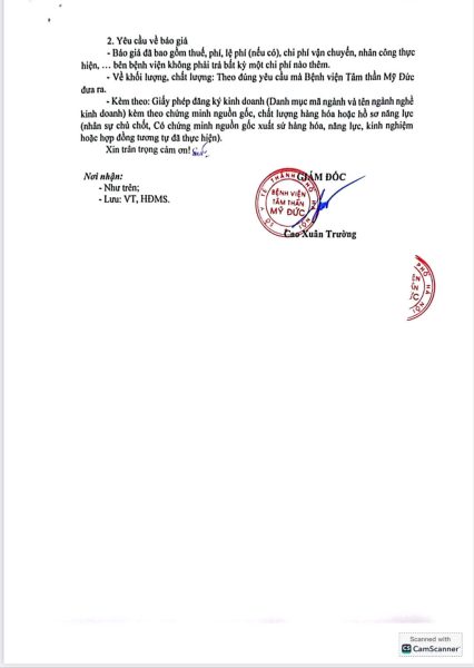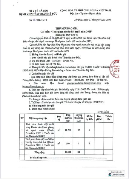 Căn cứ Quyết định số 28/QĐ-BVTT ngày 17/01/2025 của Bệnh viện Tâm thần Mỹ Đức về việc phê duyệt danh mục Thuê phun thuốc diệt muỗi năm 2025;