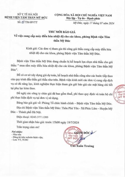 Bang cứng các đơn vị gửi về địa chỉ: Phòng TCHC Bệnh viện Tâm Thần Mỹ Đức
