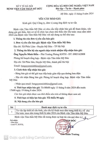 Bệnh viện Tâm Thần Mỹ Đức đang có nhu cầu tiếp nhận báo giá để tham khảo, xây dựng giá gói thầu làm cơ sở tổ chức lựa chọn nhà thầu cho dự toán mua sẵm năm 2024 của Bệnh viện Tâm Thần Mỹ Đức với nội dung cụ thể dưới đây.